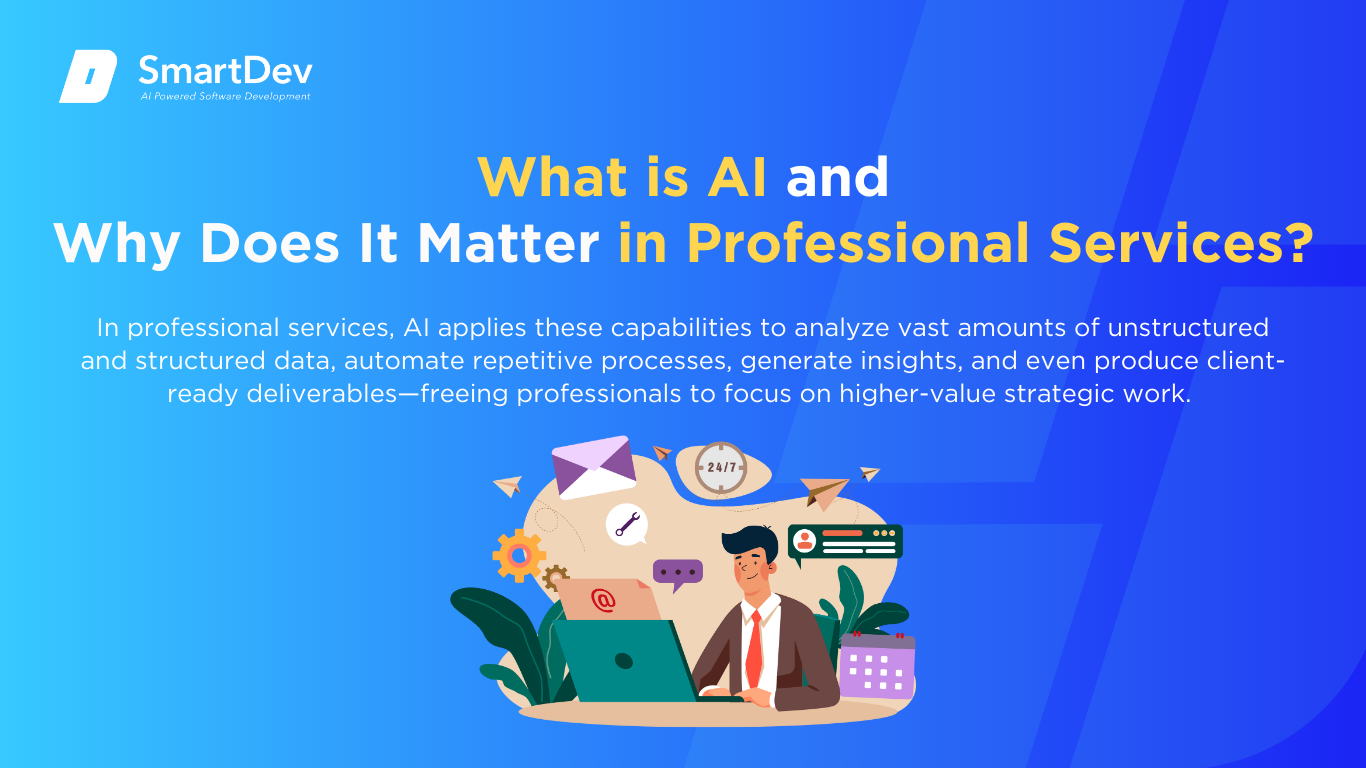 In professional services, AI applies these capabilities to analyze vast amounts of unstructured and structured data, automate repetitive processes, generate insights, and even produce client-ready deliverables—freeing professionals to focus on higher-value strategic work.