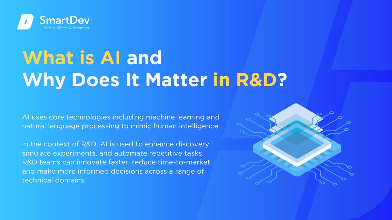 In the context of R&D, AI is used to enhance discovery, simulate experiments, and automate repetitive tasks. It helps scientists generate hypotheses, analyze massive datasets, and streamline complex workflows. As a result, R&D teams can innovate faster, reduce time-to-market, and make more informed decisions across a range of technical domains.