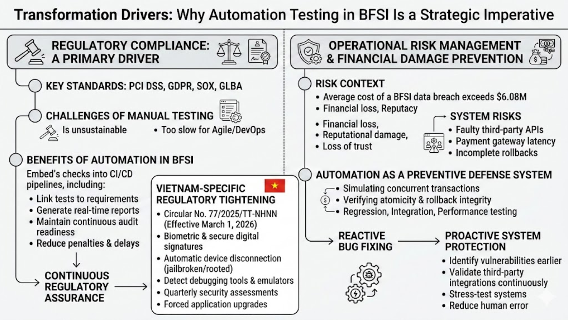 The shift from manual testing to enterprise-grade automation in the financial sector is driven by powerful structural forces. Automation testing in BFSI is no longer a technical upgrade. It is a direct response to increasing regulatory pressure, growing operational risk, and rising customer expectations for seamless digital experiences.