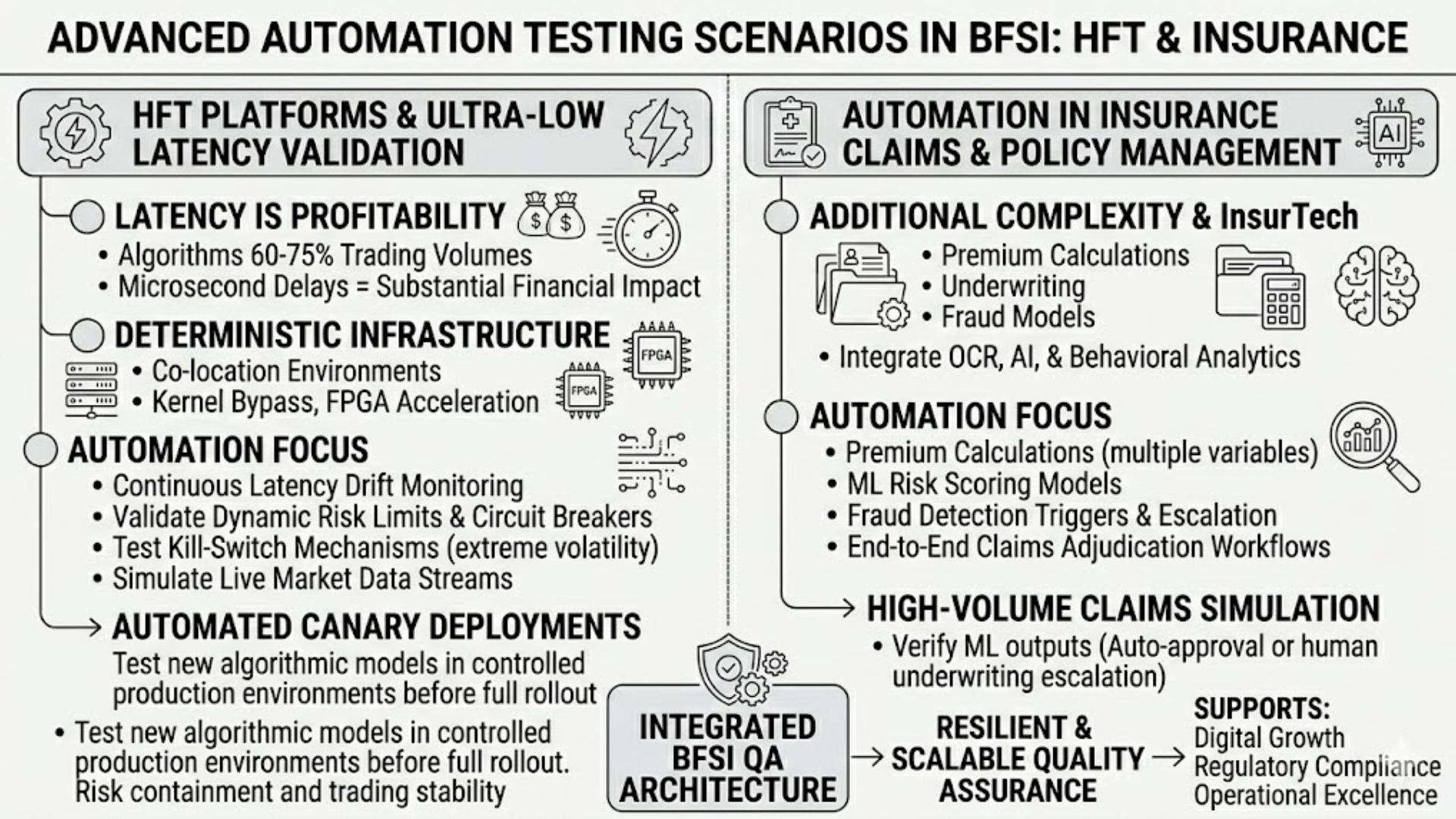 To deliver scalable quality assurance, automation testing in BFSI must integrate compliance validation, high-performance simulation, security testing, and real-time data integrity checks into a unified testing framework.