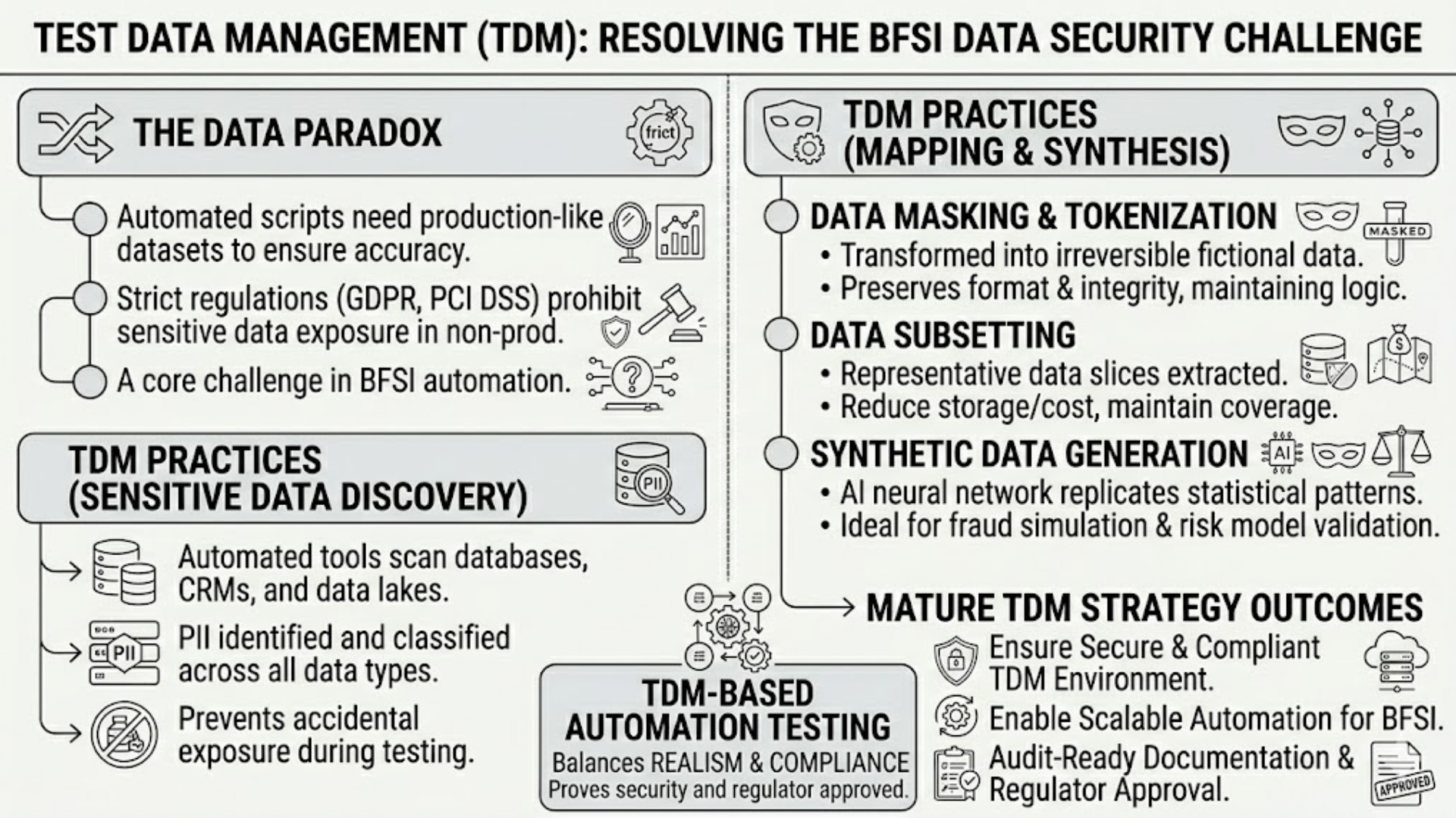 A mature TDM strategy also produces audit-ready documentation, proving that automation testing in BFSI environments remains secure, compliant, and regulator-approved.