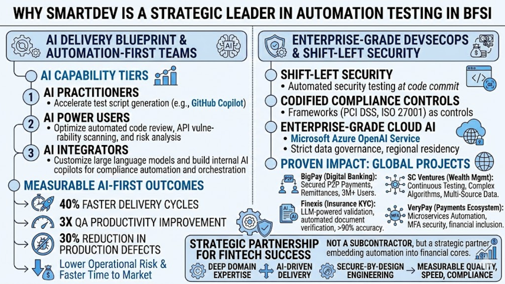 SmartDev positions itself not as a subcontractor, but as a strategic advisory and execution partner that embeds automation into the core of financial systems. By combining deep domain expertise in banking and fintech with AI-driven delivery and secure-by-design engineering, SmartDev delivers measurable outcomes in quality, speed, and compliance.