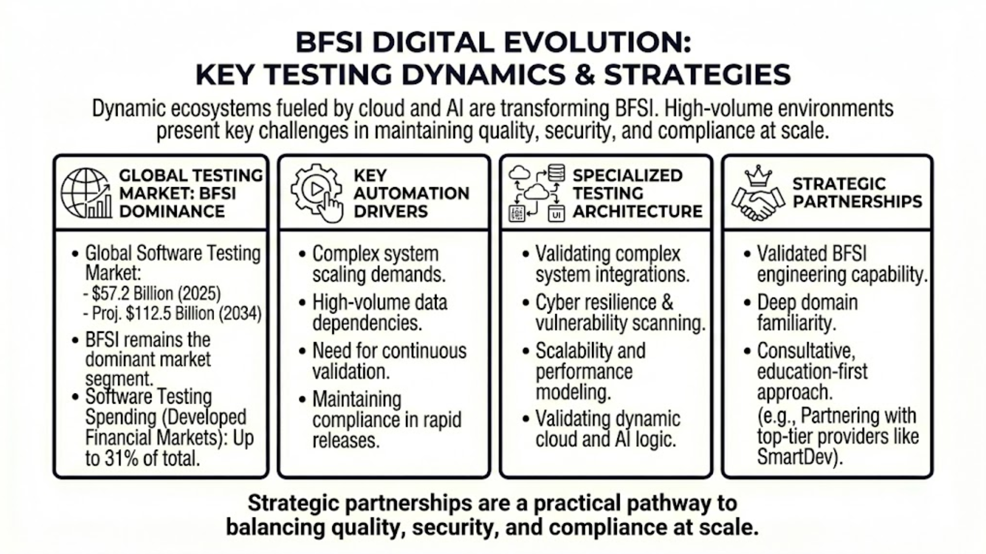 The rapid evolution of digital technology within the Banking, Financial Services, and Insurance (BFSI) industry is transforming its entire landscape. Over the last decade, financial institutions have shifted from traditional monolithic frameworks to dynamic, data-driven ecosystems fueled by cloud computing and artificial intelligence. However, this surge in innovation presents a significant challenge: how to maintain quality, security, and compliance at scale without slowing down product releases.