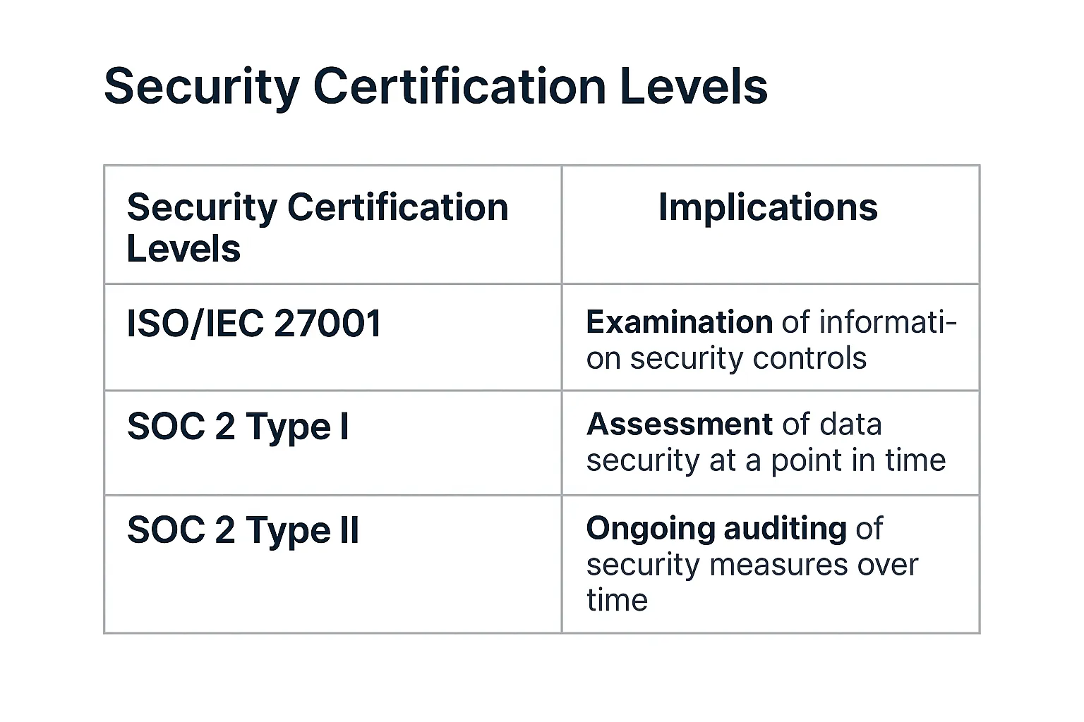 AI amplifies security risks if not handled properly. Require partners with ISO/IEC 27001 and SOC 2 Type II certifications as minimum standards. These aren’t just checkboxes—they indicate systematic approaches to data protection and process security.