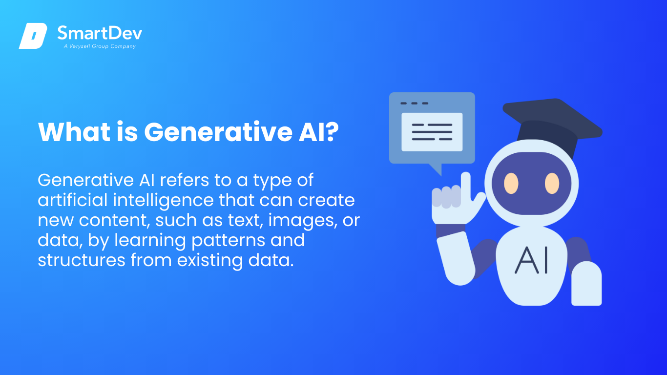 Generative AI refers to a type of artificial intelligence that can create new content, such as text, images, or data, by learning patterns and structures from existing data. Unlike traditional AI, which primarily focuses on analyzing and making predictions based on input data, generative AI has the capability to generate entirely new, previously unseen data. It works by leveraging advanced machine learning models, such as neural networks and deep learning algorithms, which are trained on large datasets to understand underlying patterns and structures.