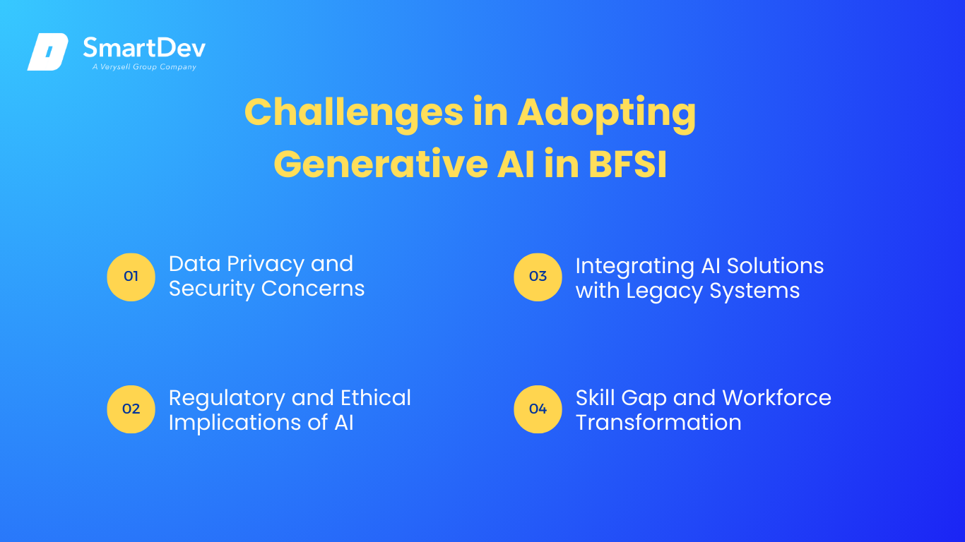 However, the adoption of AI comes with its own set of challenges, including data privacy concerns, regulatory compliance, and the need for skilled talent. To successfully navigate these challenges and unlock the full potential of AI, BFSI firms must partner with experienced AI providers like SmartDev. By embracing generative AI technologies, firms can not only transform their operations but also position themselves for long-term growth and innovation in the rapidly evolving financial landscape.