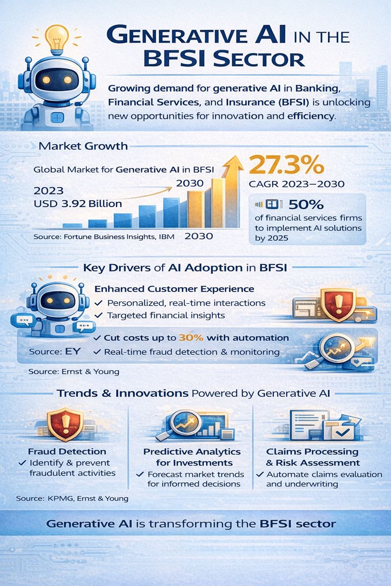 The adoption of generative AI within the Banking, Financial Services, and Insurance (BFSI) sector has witnessed rapid growth in recent years, as organizations seek innovative solutions to improve operational efficiency, enhance customer experience, and ensure security. According to a report by Fortune Business Insights, the global market for generative AI in BFSI is expected to grow from USD 3.92 billion in 2023 to USD 22.82 billion by 2030, reflecting a compound annual growth rate (CAGR) of 27.3% from 2023 to 2030. This surge in demand highlights how generative AI is transforming financial institutions, driving new opportunities for innovation and differentiation.