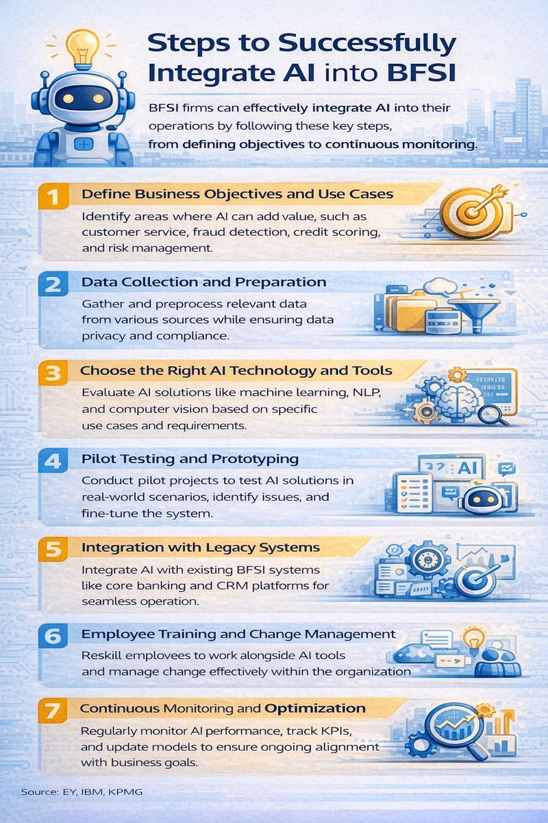 Integrating AI into BFSI firms is a strategic process that requires careful planning, investment, and alignment with business objectives. The following steps can help financial institutions successfully adopt and implement AI solutions: