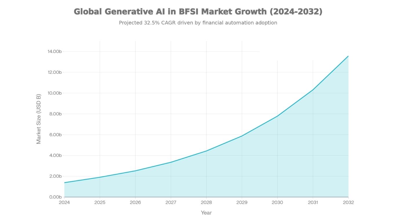 2025 marks a critical inflection point for generative AI adoption in BFSI. The global market has reached USD 1.38 billion in 2024 and is projected to grow to USD 1.90 billion in 2025, with an impressive compound annual growth rate (CAGR) of 32.5% through 2032. This exponential growth reflects the technology’s transition from experimental pilots to strategic, enterprise-wide deployment across financial institutions worldwide.