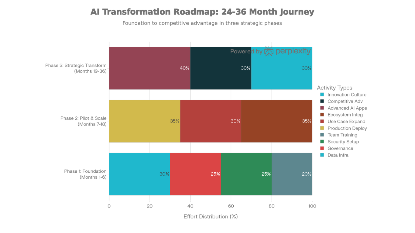 - Strategic transformation (36 months): AI-native operating model, competitive differentiation, industry leadership positioning