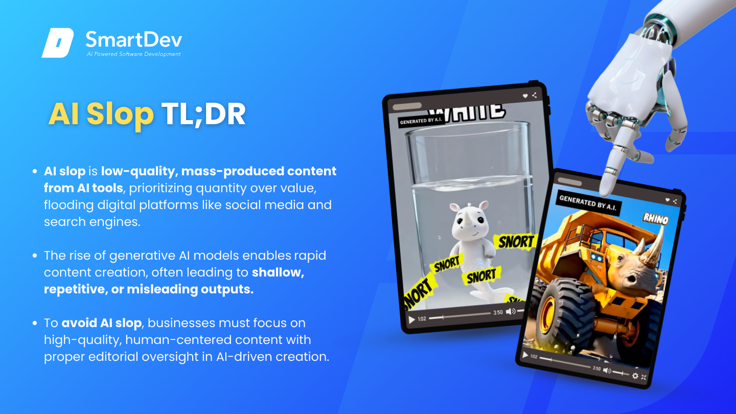 AI slop refers to low-quality content churned out by AI systems designed to maximize engagement, clicks, or revenue without regard for real value. This includes generic articles, repetitive videos, shallow social media posts, and more. Often, AI-generated slop is produced without meaningful oversight or creative input, sacrificing quality for quantity. The goal of AI slop is to generate high volumes of content for the sake of ranking, clicking, and engaging, not for genuinely solving problems or informing audiences.