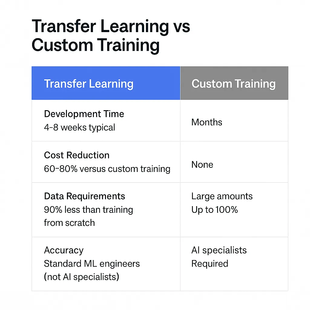 - Transfer learning: 85-95% accuracy, 4-8 week deployment