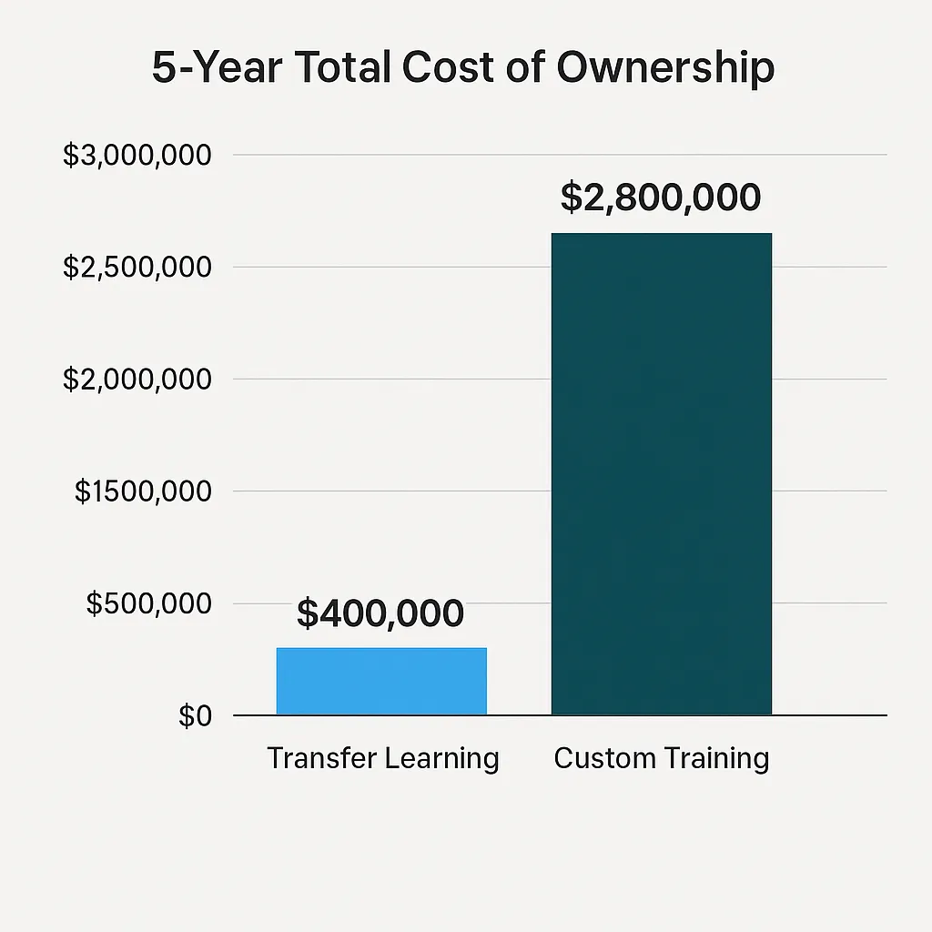 Transfer learning delivers optimal ROI for enterprises with limited budgets, tight timelines, or standard use cases like document processing and customer service. Training from scratch becomes cost-effective only when proprietary data advantages justify massive additional investment.