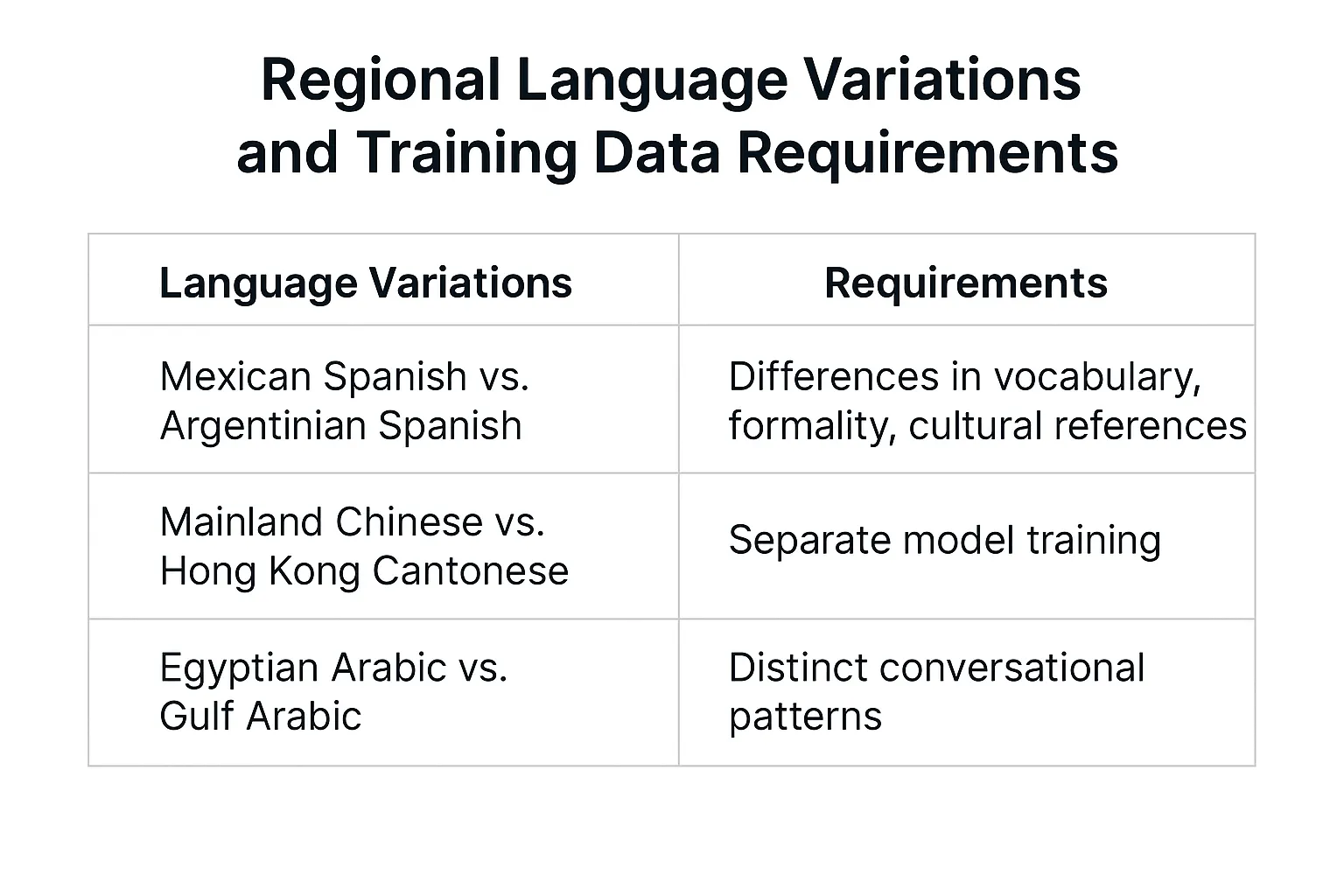Leading NLP vendors now require dialect detection for Chinese, Arabic, and Spanish, with regional segmentation as standard practice for chatbots targeting more than 10,000 monthly users.