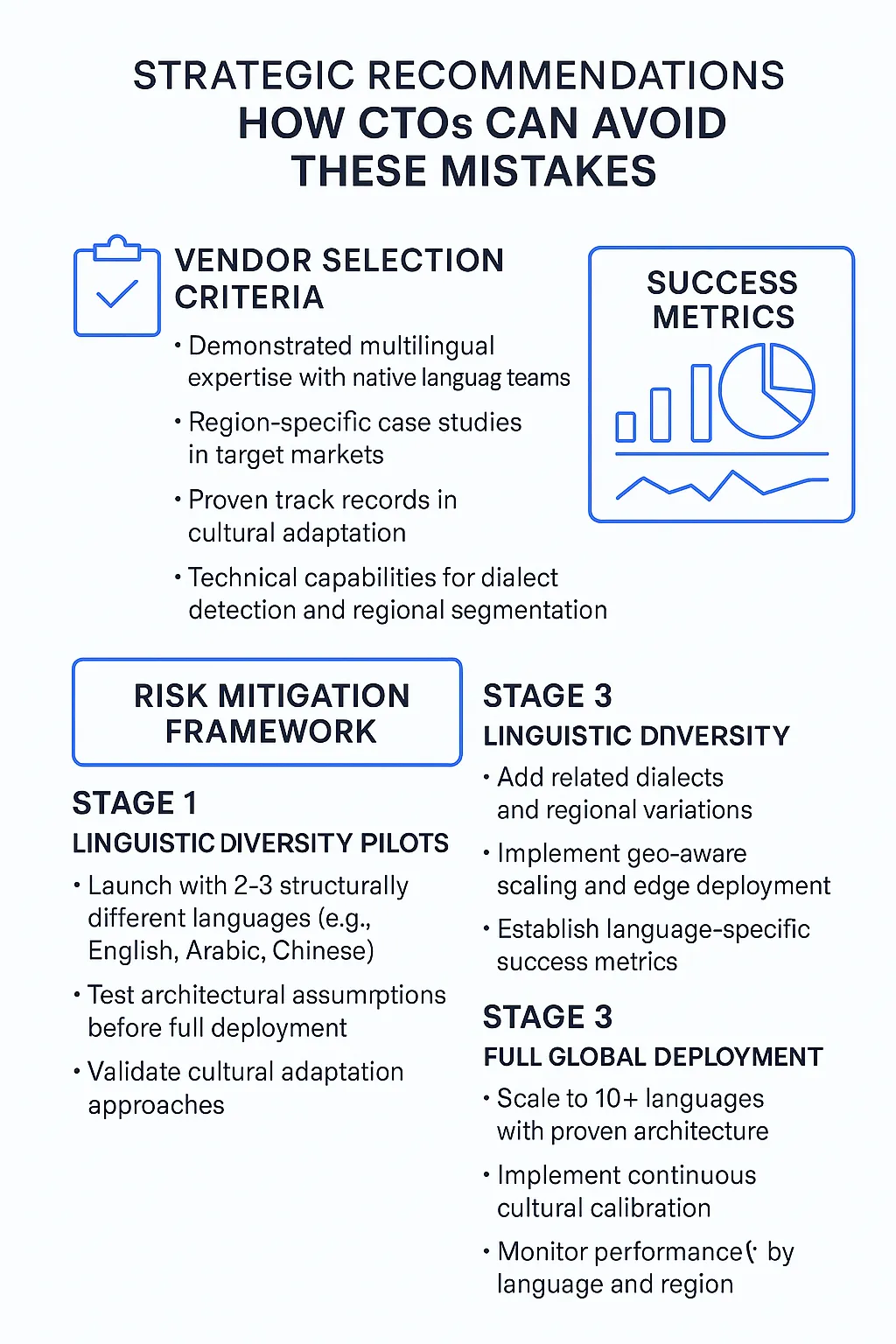 CTOs must establish native speaker testing protocols for each target language, but many underestimate the complexity and cost of comprehensive multilingual QA.