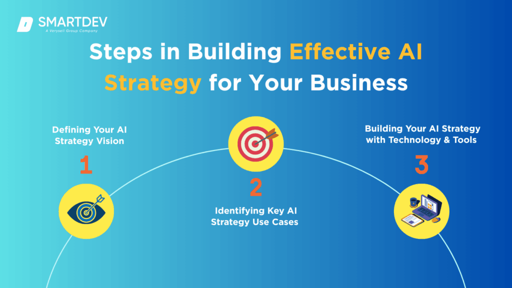 The first step in building your AI strategy is to craft a clear and compelling vision. AI should not be implemented simply because it is a trend; it should serve as a tool to achieve specific business outcomes. To get started, ask critical questions like: