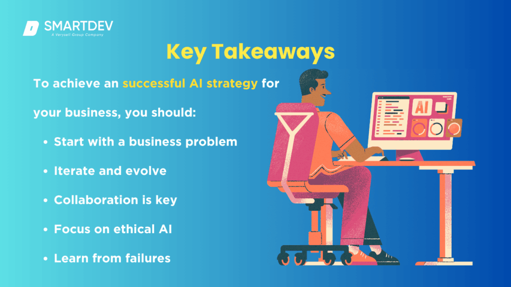 Successfully implementing an AI strategy requires constant alignment with business goals and an ongoing evaluation of its impact. Here are key takeaways for ensuring your AI strategy leads to lasting success: