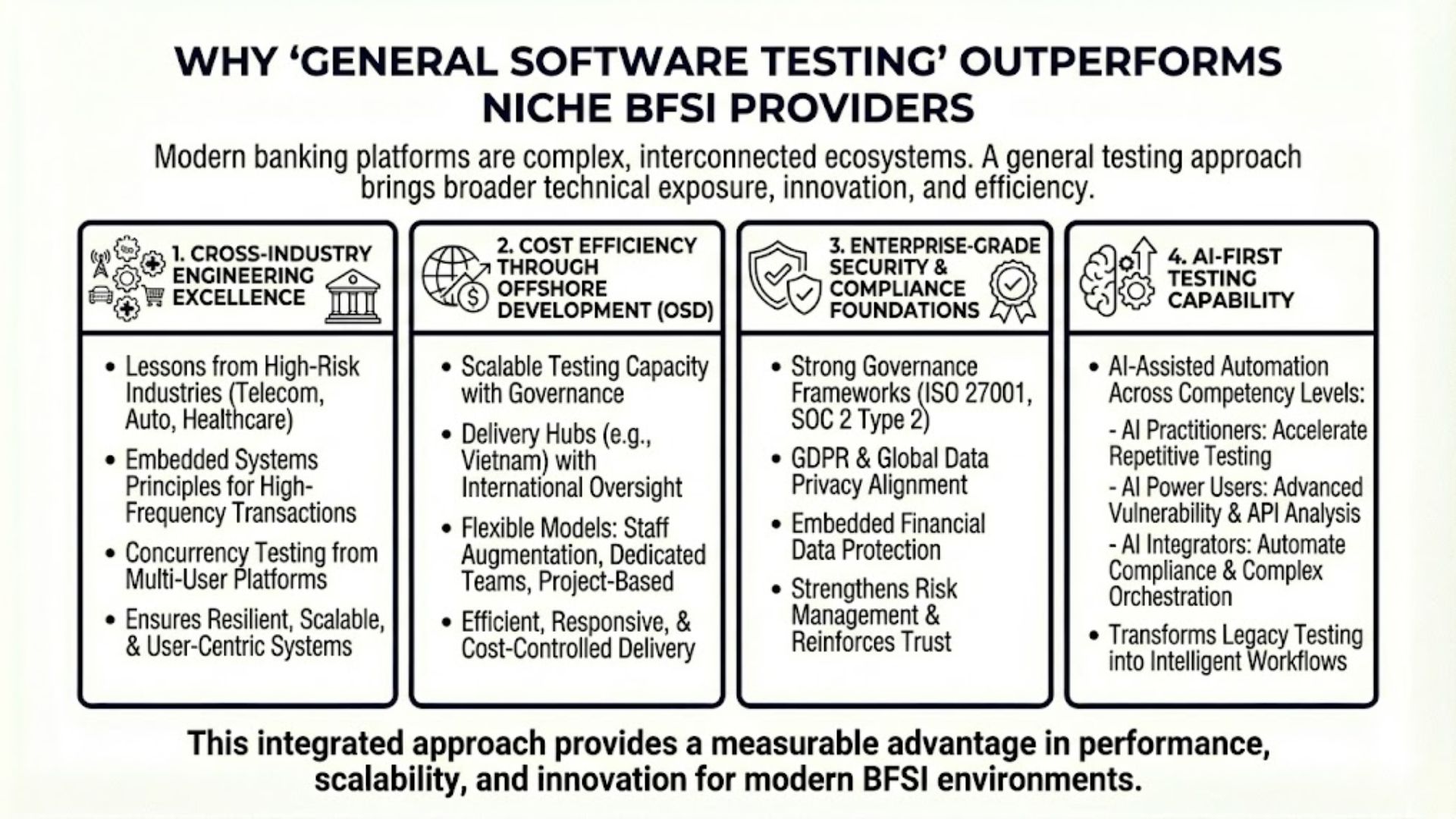 When selecting a partner for software testing for BFSI, many banks instinctively choose niche providers that focus exclusively on financial systems. While this ensures regulatory familiarity, it often creates a strategic blind spot: limited cross-industry innovation and siloed thinking.