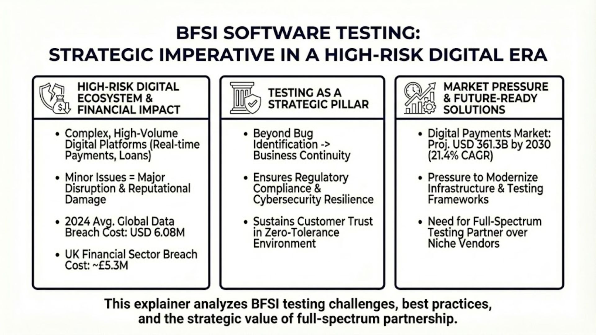 This Technology Explainer provides a comprehensive analysis of the technical challenges in BFSI testing, outlines best-practice testing methodologies, and explains why partnering with a full-spectrum software testing provider offers a more scalable and future-ready solution than relying solely on niche testing vendors in today’s digital-first financial landscape.