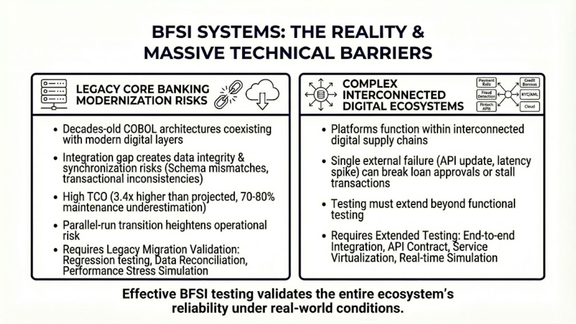 One of the most persistent challenges in software testing for BFSI is the coexistence of legacy core systems and modern digital layers. Many global banks still run mission-critical core banking platforms built on COBOL-based architectures developed decades ago. While stable, these systems were not designed for today’s API-driven, cloud-native, microservices-based ecosystems.